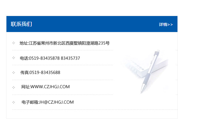 地址:常州市新北區友邦商務大廈1幢16、17層  電話:0519-85101652  傳真:0519-85112595  郵編:213022  網址:www.cz-jiayue_cn.bjbswyys.com  郵箱:xiajifengaa@163.com